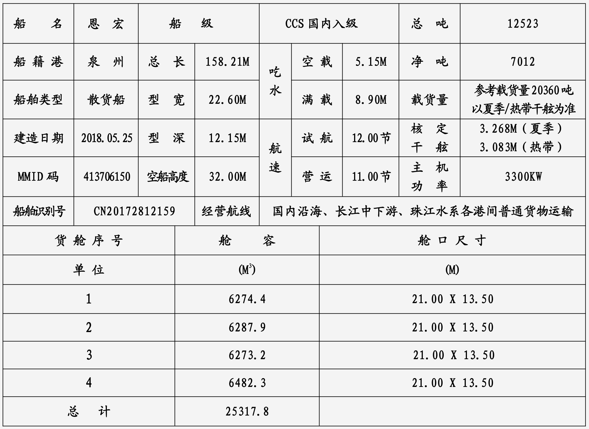 船 級:CCS國內(nèi)入級