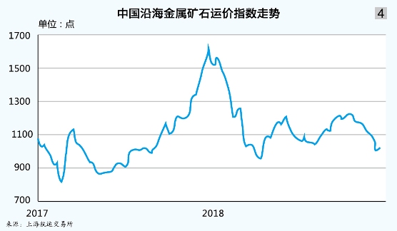 2018年,沿海金屬礦石運價先抑后揚,運價水平高于2017年同期。由于2018年環(huán)保限產(chǎn)較嚴,鋼廠對優(yōu)質(zhì)礦需求提升。同時,低庫存使得鋼廠存在進一步補庫空間,市場心態(tài)較為積極,終端需求釋放,鐵礦石運價得到支撐。