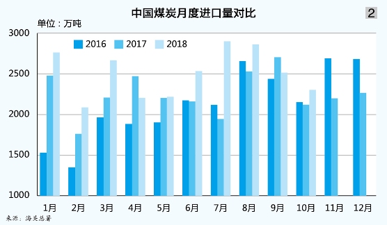 據(jù)海關(guān)總署發(fā)布的數(shù)據(jù),前10月,全國累計進口煤炭2.52億噸,較2017年同期增加2593.3萬噸,同比增長11.5%;總金額為1448.6億元,同比增長13.3%。2018年進口煤增速最高的月份集中于2—3月和6—8月 (見圖2)。