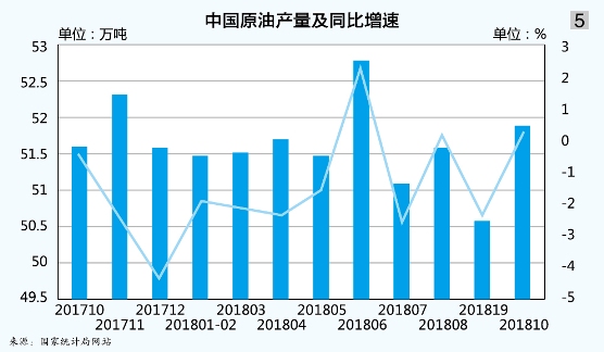 前10月,中國規(guī)模以上工業(yè)原油生產(chǎn)平穩(wěn),累計完成15721萬噸,同比下降1.7%,為連續(xù)3年減產(chǎn);跌幅較2017年同期減少2.4個百分點,跌幅為連續(xù)兩年縮減 (見圖5)。