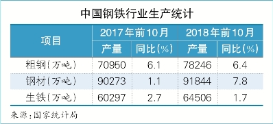 國家統(tǒng)計局數(shù)據(jù)顯示,前10月,粗鋼、鋼材和生鐵產(chǎn)量分別為78246萬噸、91844萬噸、64506萬噸,同比分別增長6.4%、7.8%、1.7%,增速較2017年同期分別增加0.3個百分點、6.7個百分點、減少1.0個百分點(見表)。