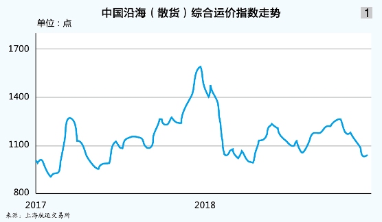 2018年,隨著供給側(cè)結(jié)構(gòu)性改革不斷深化,中國經(jīng)濟發(fā)展對大宗散貨需求逐步減弱,煤炭、礦石、糧食等沿海運輸需求增速下降壓力較大,散貨總體運輸需求增速放緩。前11月,全國水路貨運量完成64.1億噸,同比增長4.7%,增速較2017年同期減少0.8個百分點;貨物運輸周轉(zhuǎn)量完成90229億噸公里,同比增長0.2%,增速較2017年同期減少2.0個百分點。2018年,沿海散運市場運價水平小幅高于2017年。一方面,燃油價格大幅上漲增加了航運企業(yè)的運輸成本,使得市場對低運價接受度降低;另一方面,非煤貨種需求較為強勁,運力需求上升,沿海散運市場運力出現(xiàn)階段性緊張,推高運價,而氣候也對運價的推漲起到一定作用。12月14日,上海航運交易所發(fā)布的中國沿海(散貨)綜合運價指數(shù)報收于1044.51點;年均值為1152.71點,同比上升1.8%(見圖1)。