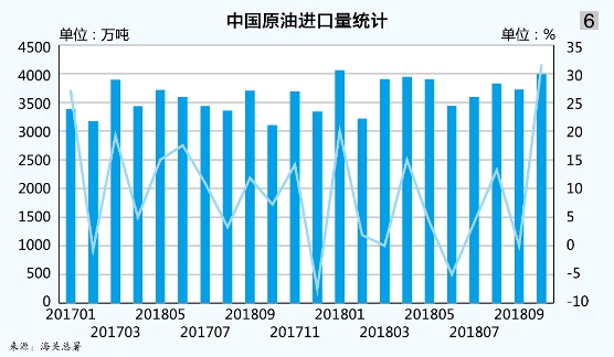 2018年,中國宏觀經(jīng)濟繼續(xù)保持總體平穩(wěn)、穩(wěn)中向好態(tài)勢。在消費增長、產(chǎn)量下跌、煉廠開工率上升的情況下,原油進口保持增長態(tài)勢。前10月,進口原油37716萬噸,同比增長8.1%,受高油價影響,增幅較2017年同期減少。月進口量除2月、6月外,均在3500萬噸以上,其中10月份進口量達到4080萬噸,同比增長31.5%(見圖6)。